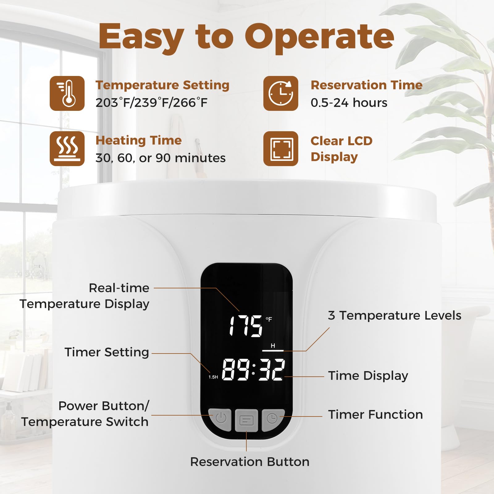 - User-Friendly Design: The clear LCD display of the hot towel bucket keeps you informed with real-time temperature and remaining time. And with intuitive buttons, you can effortlessly set your desired temperature among 3 temperature levels, choose from 30/60/90 min heating periods, and adjust the delay timer between 0.5 to 24 hours to suit your schedule.