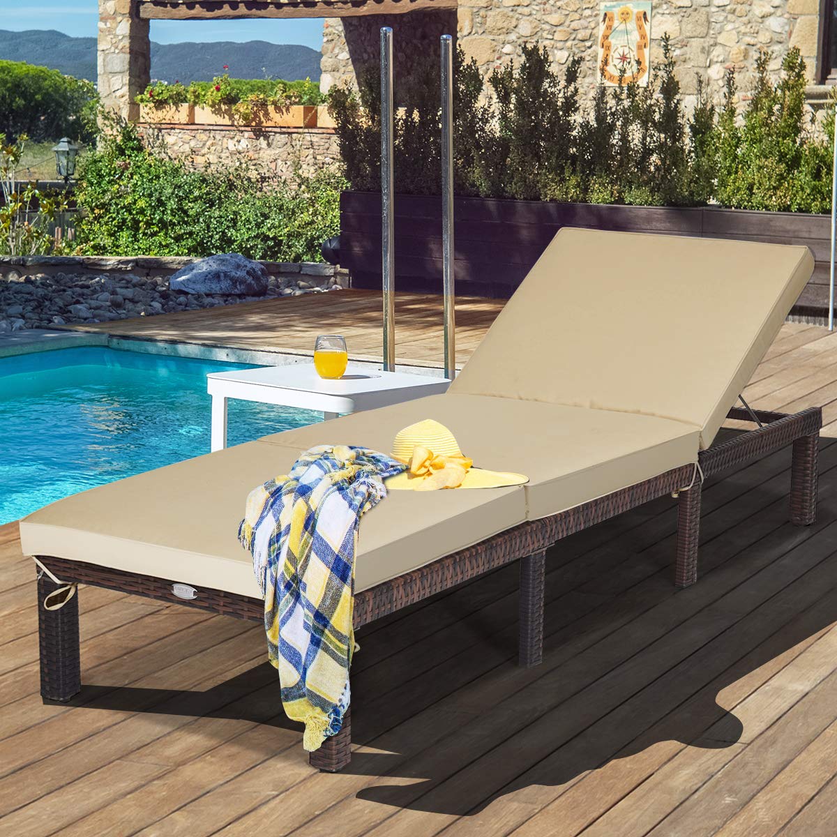 COSTWAY 2PCS Patio Rattan Lounge Chair, 6-Gear Adjustable Chasie Lounge, Outdoor Recliner for Deck, Backyard (Brown)