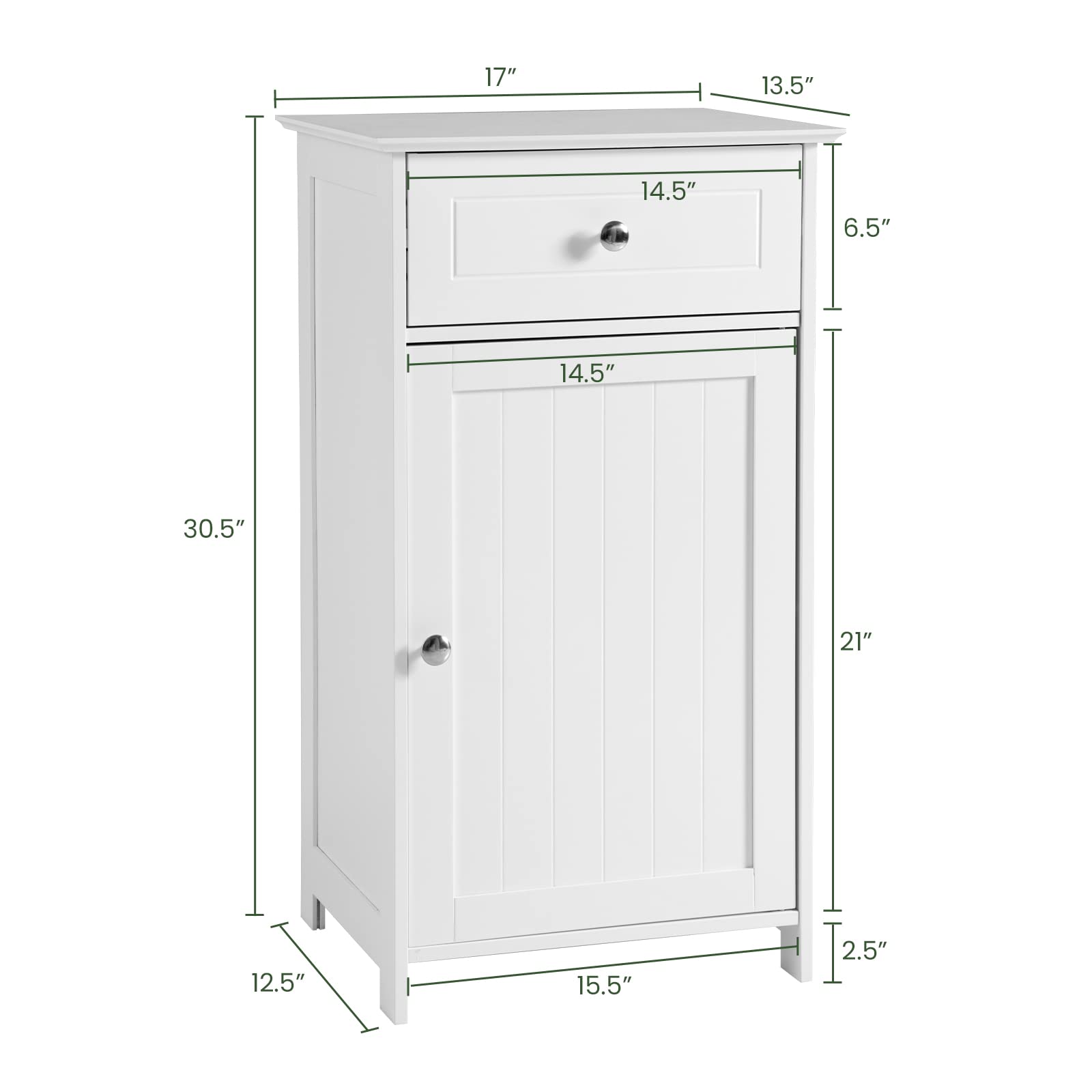 - [Modern Elegant Style] With all white appearance, this simple bathroom floor cabinet brings elegant style to your home.The beautiful paneling door and smooth lines bring you the enjoyment of beauty, making the cabinet suitable any home decor.Besides, exquisite round knob allows you to open and close the cabinet more convenient.