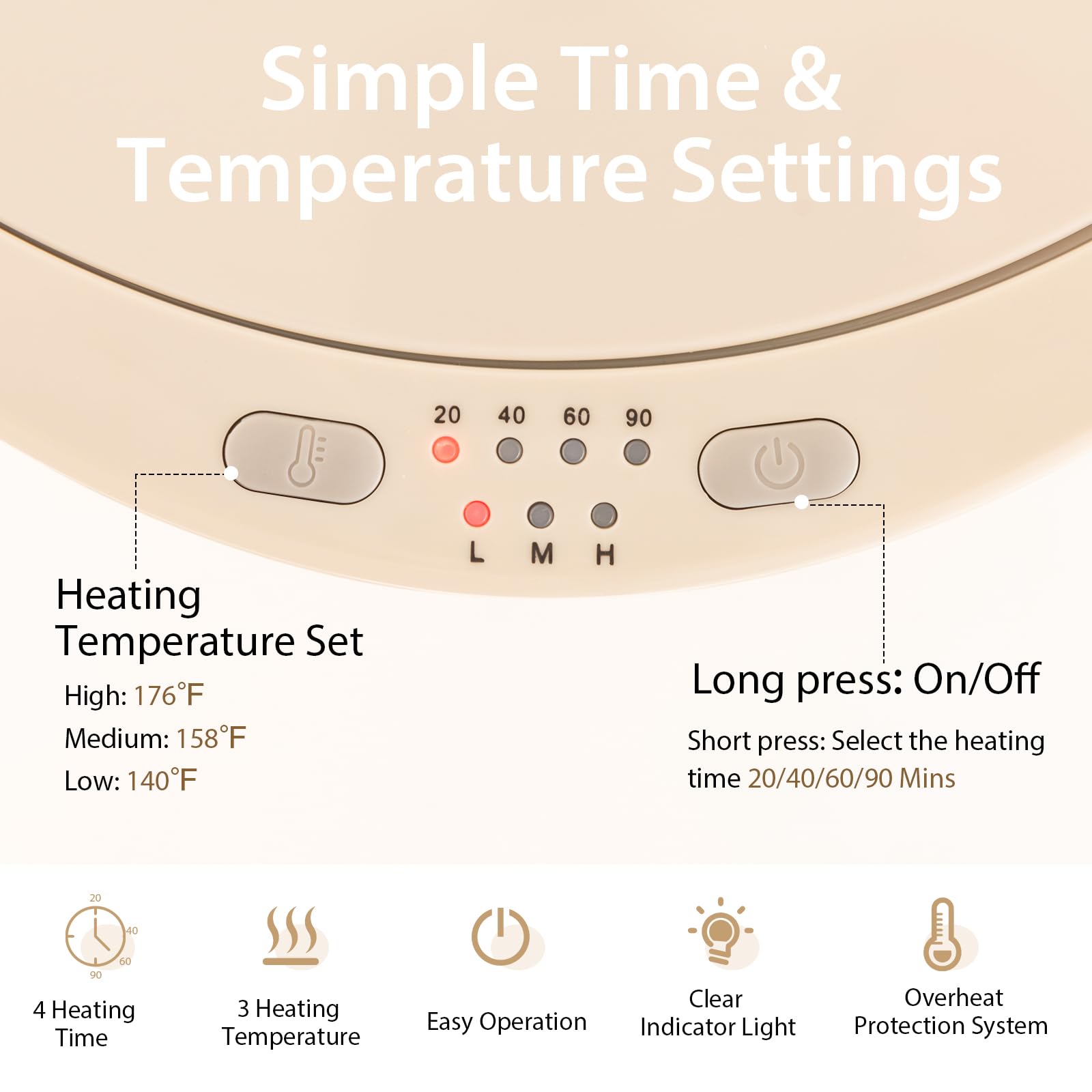 - [Simple Time & Temperature Settings:]This towel warmer offers easy and intuitive controls. Choose from three heating options: high (176℉), medium (158℉), and low (140℉). Simply long press for on/off and short press to select the desired heating time of 20/40/60/90 minutes.
