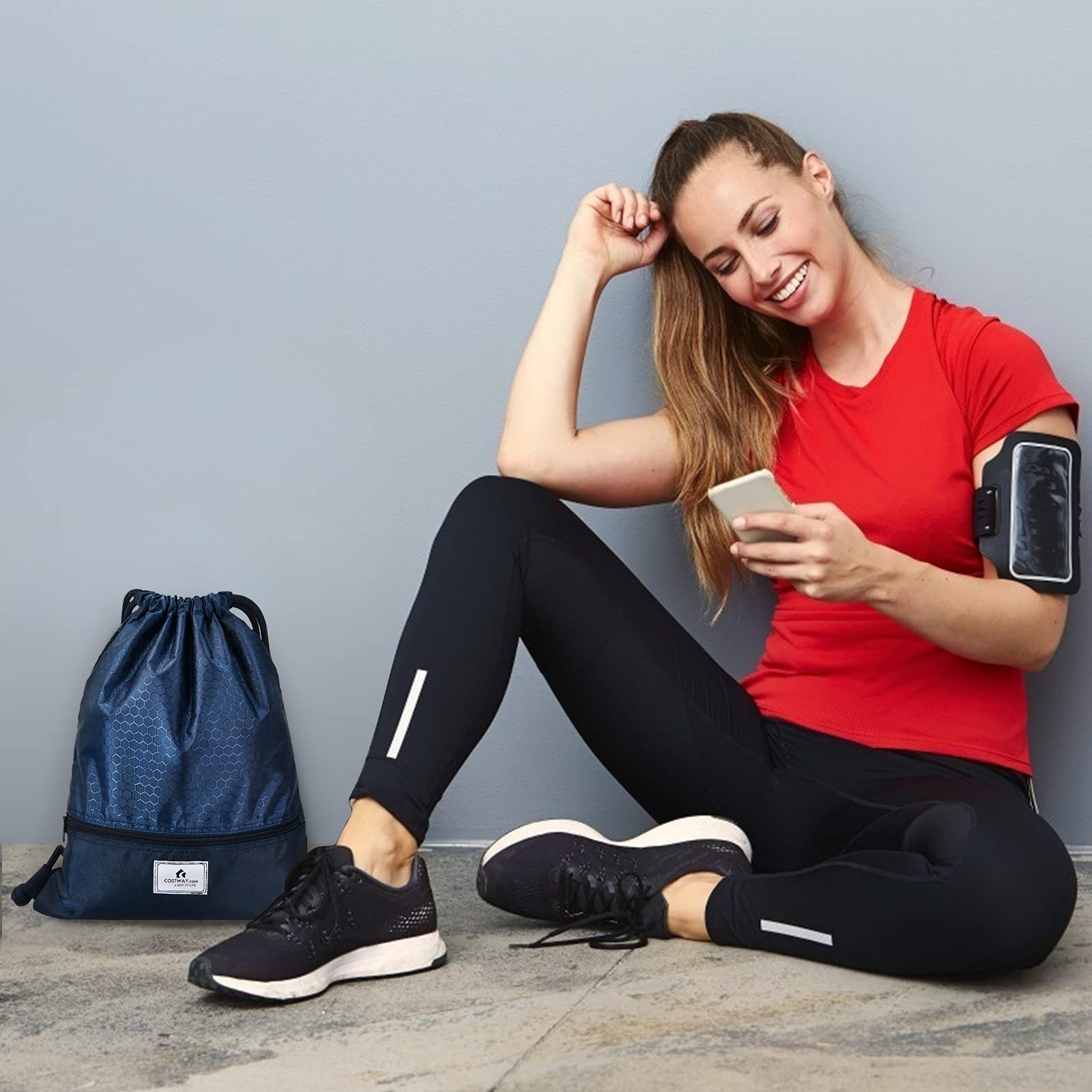 COSTWAY Drawstring Backpack, Folding Sports Gym Sackpack with Zipper Pockets, String Cinch Bag for Gym Shopping Sport Yoga Beach Travel Camping Workout Gear (Blue)