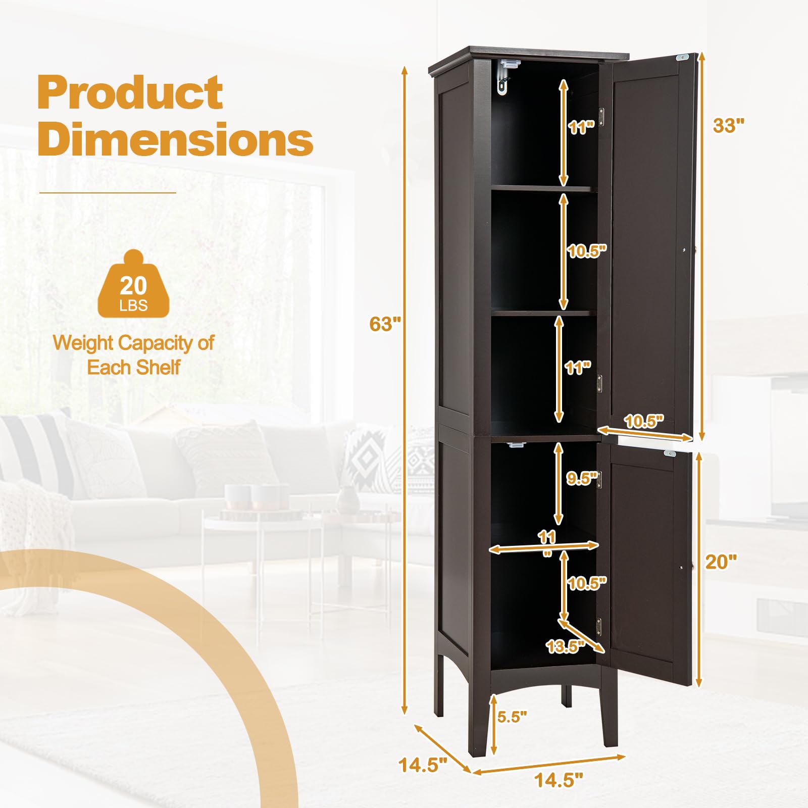 COSTWAY Tall Bathroom Storage Cabinet, 5-Tier Freestanding Linen Tower Cabinet with 2 Doors, Wooden Side Storage Organizer, Narrow Slim Floor Cabinet for Bathroom, Living Room, Kitchen (Brown)